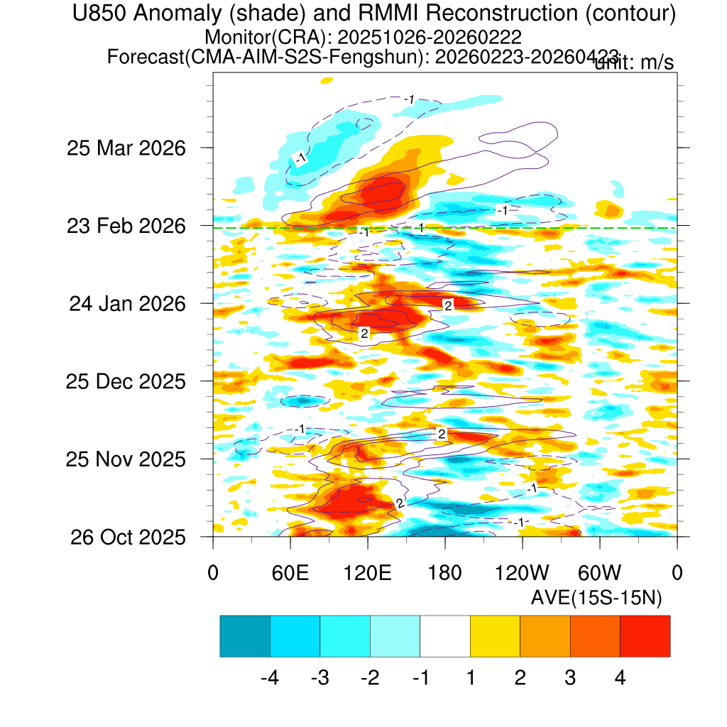 850hPa纬向风场和OLR异常场时间-经度/时间-纬度剖面图(过去120天监测与未来60天预测)