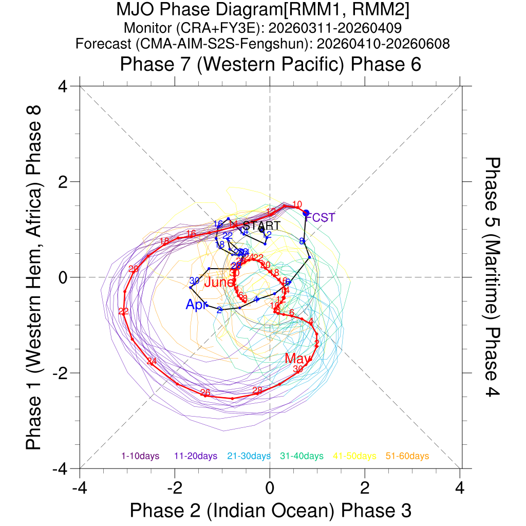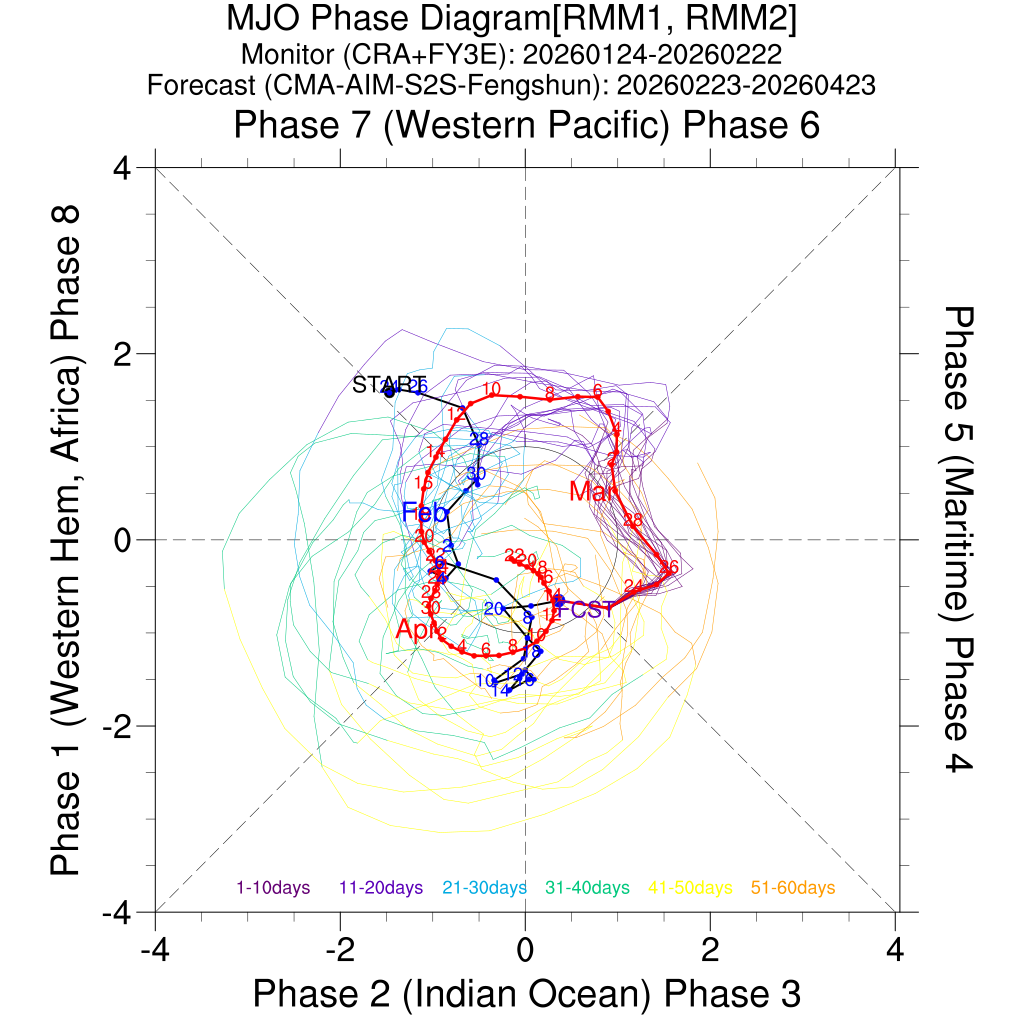 RMM指数空间位相图(过去30天监测与未来60天预测)