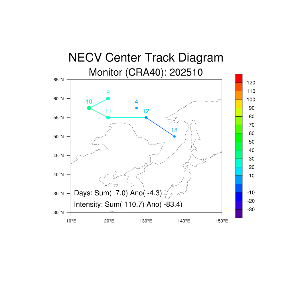 月尺度东北冷涡中心密度及异常(本月至今监测)