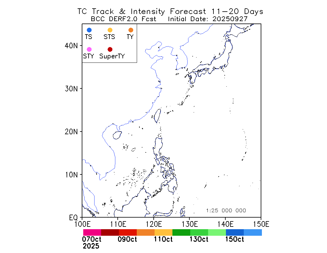 产品表示Derf2.0自起报时间开始预测未来第11-20天逐日的台风活动路径和强度(路径连线的颜色代表11-20天预测的某一天,圆点位置和颜色分别代表台风的活动位置和强度级别),产品图在每年6月21日-9月30日逐日更新。