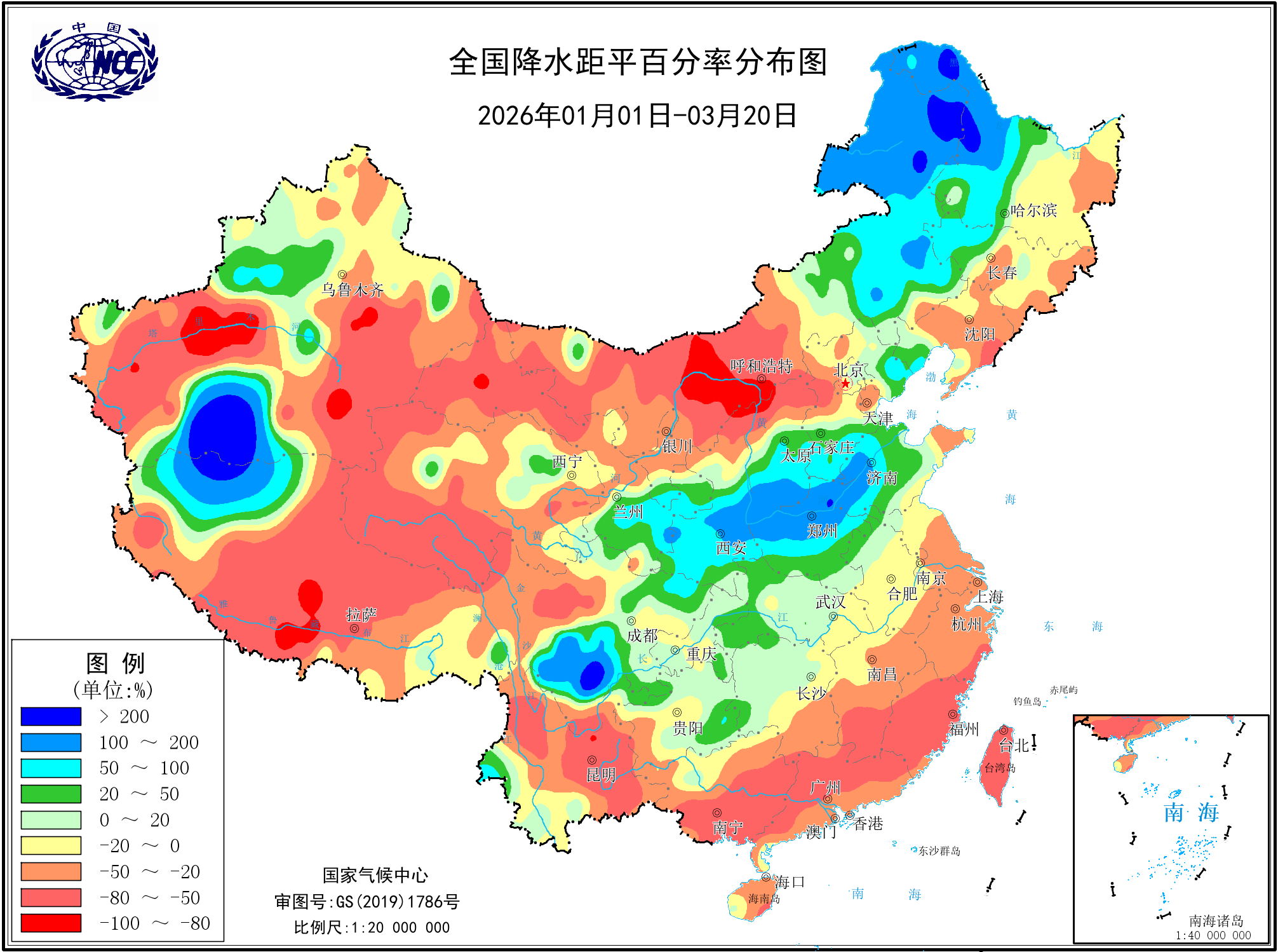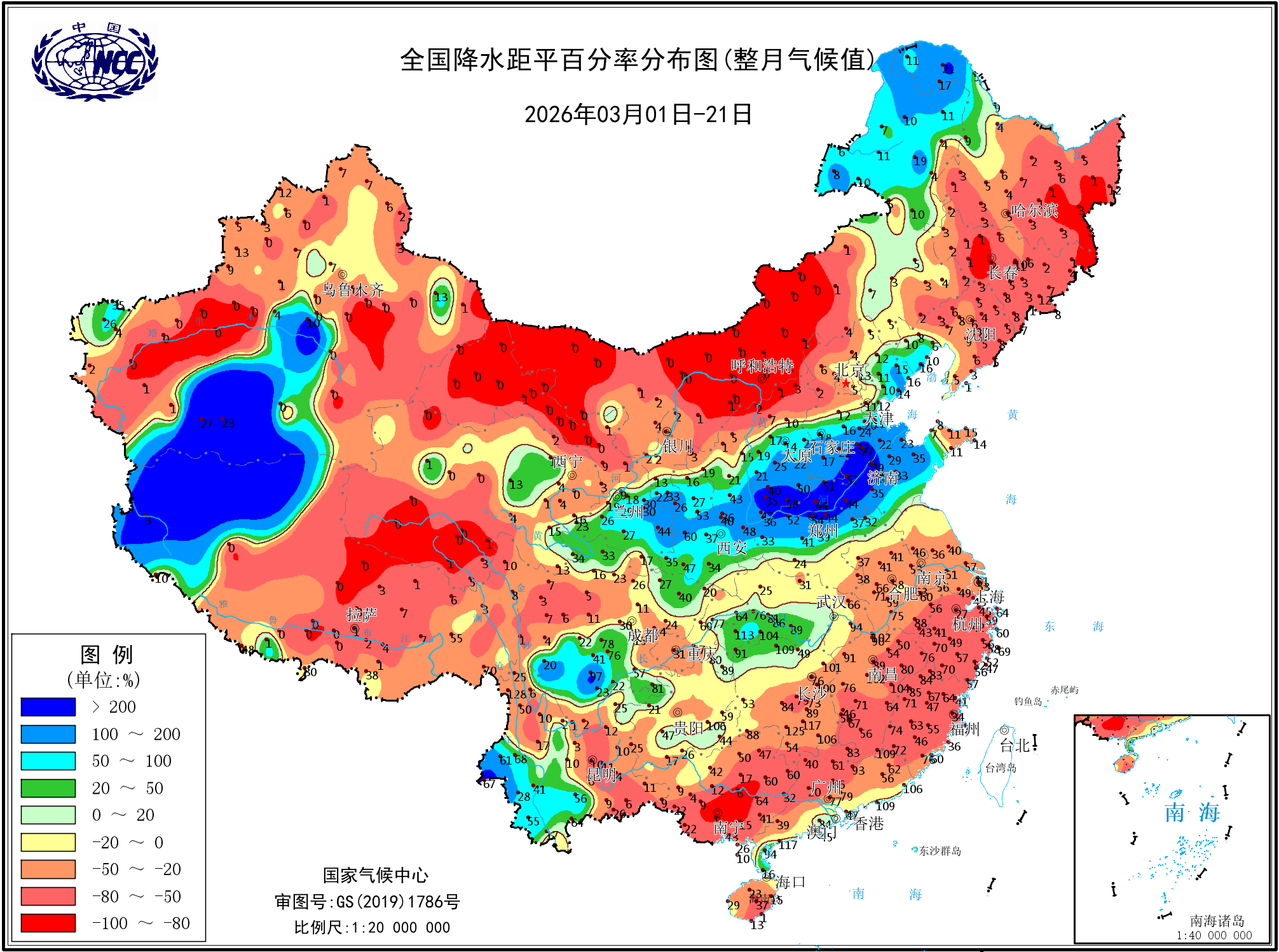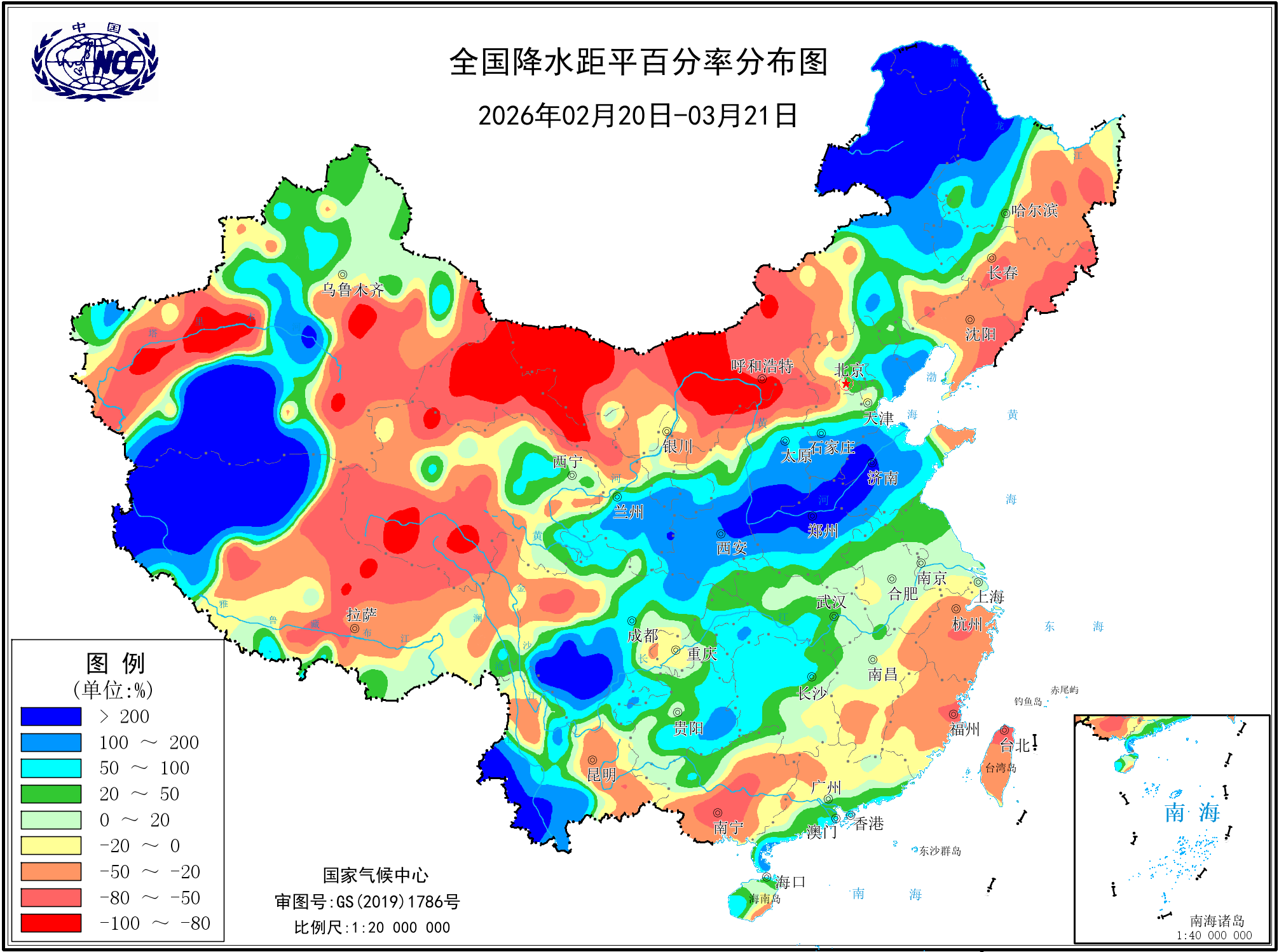 降水距平百分率(最近20天)