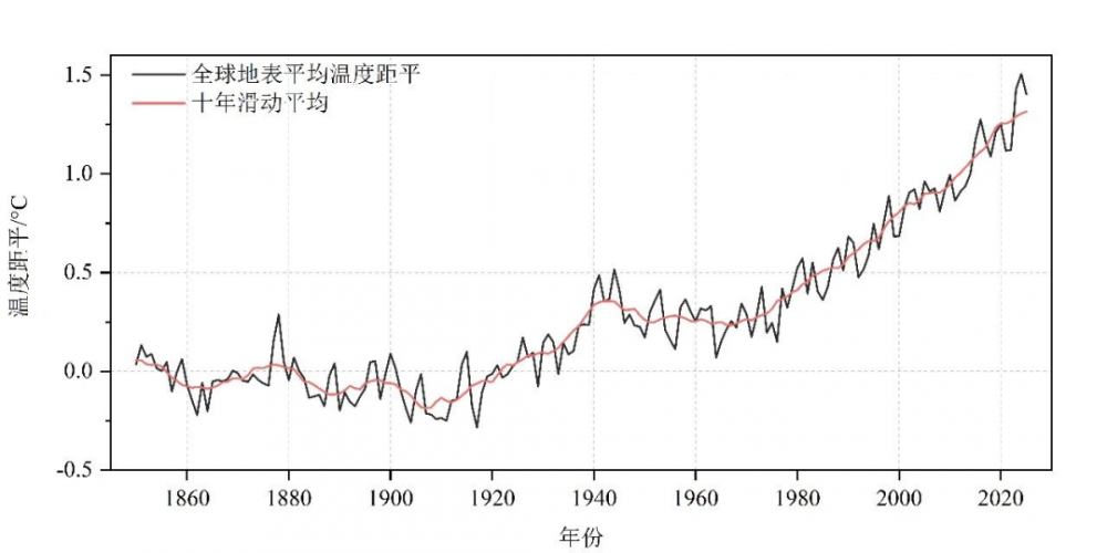 The global average surface temperature anomaly time series from 1850 to 2025 (relative to the average from 1850 to 1900)