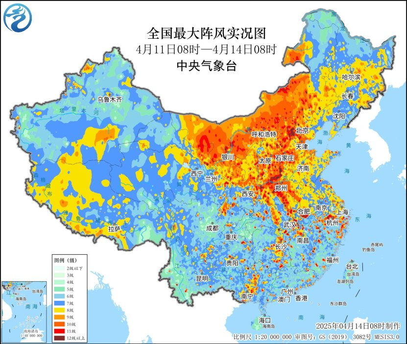 From April 10 to 14, gusts of above level 12 occurred in 23 provinces. The maximum wind speeds at 64 national meteorological stations broke historical records. Beijing issued its first citywide orange gale warning in nearly a decade. Meanwhile, the largest sandstorm in nearly a decade swept across central and eastern China, covering an area of over 4.3 million square kilometers. The sand and dust traveled as far south as Hainan.