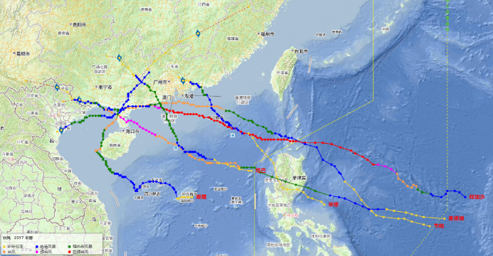 The moving paths of the six typhoons that made landfall in Guangdong in 2025