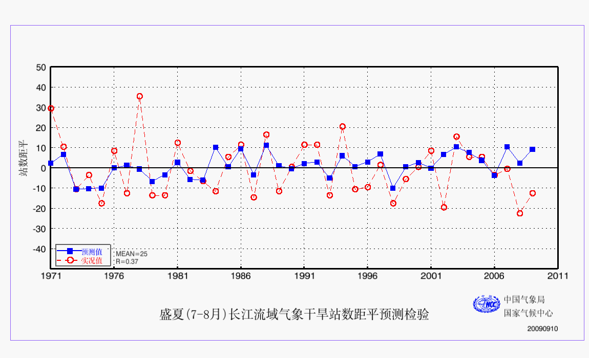 16 盛夏(7-8月)长江流域气象干旱站数距平预测检验 AAA 检验 2009
