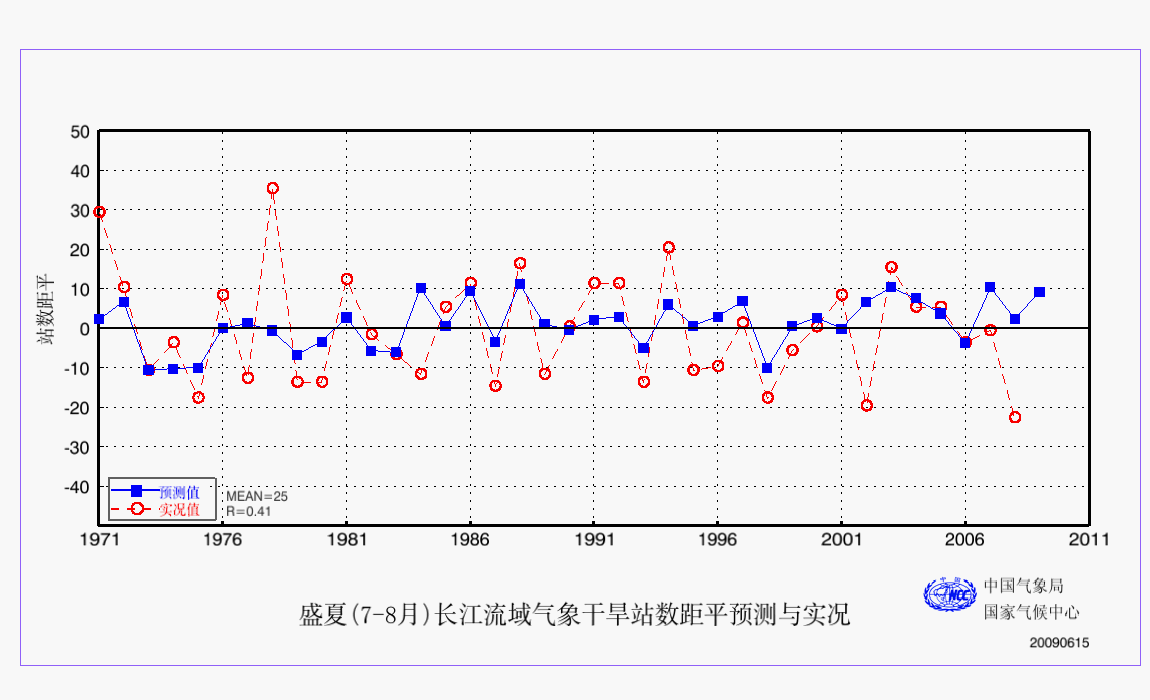 15 盛夏(7-8月)长江流域气象干旱站数距平预测与实况 盛夏 AAA 预测实况 2009