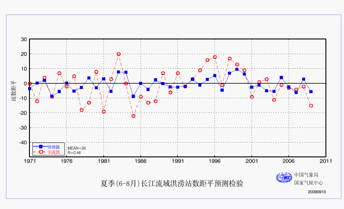 14 夏季(6-8月)长江流域洪涝站数距平预测检验 AAA 检验 2009
