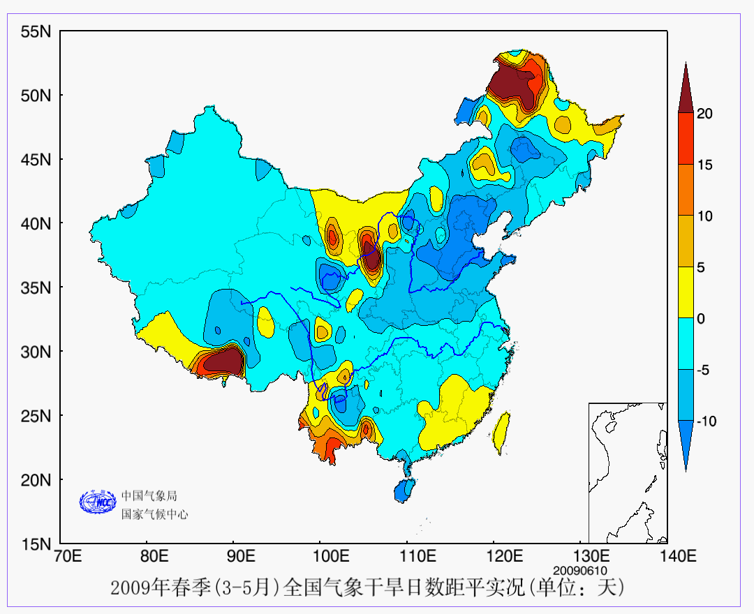 3 YEAR年春季(3-5月)全国气象干旱日数距平实况 AAA 实况 2009