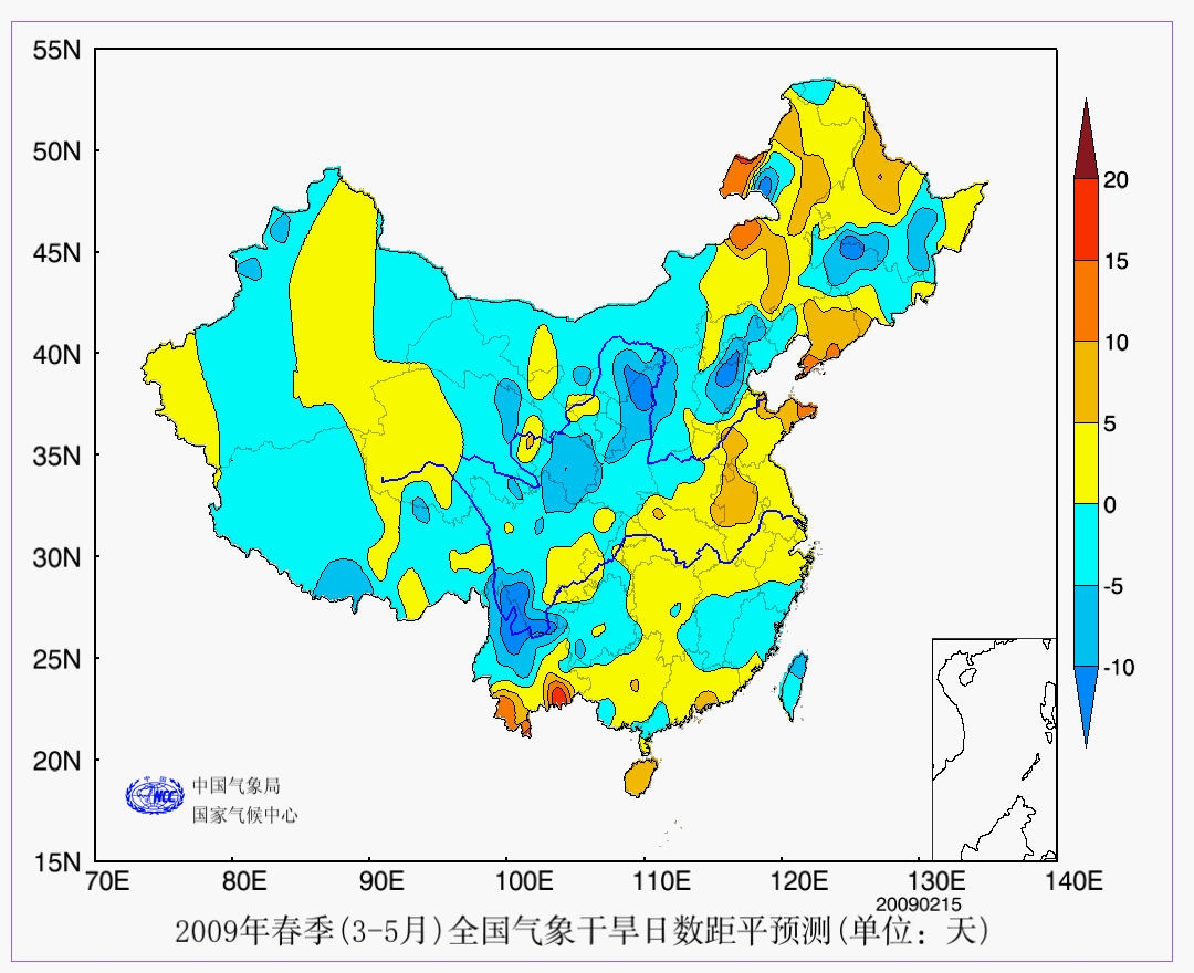 1 YEAR年春季(3-5月)全国气象干旱日数距平预测 春季 全国 日数 AAA 预测 2009
