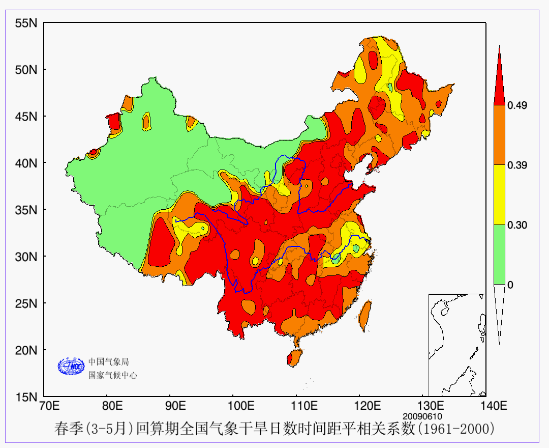 2 春季(3-5月)回算期全国气象干旱日数时间距平相关系数 ACC 分布 2009