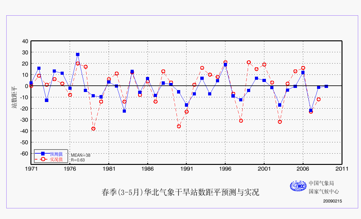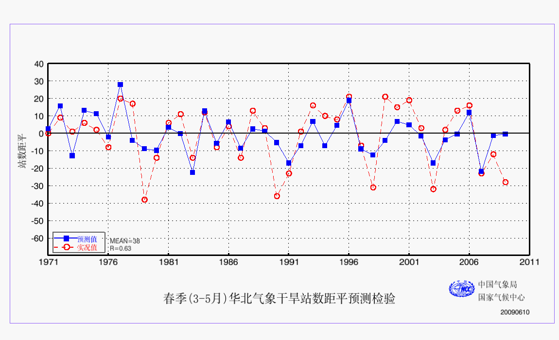8 春季(3-5月)华北气象干旱站数距平预测检验 AAA 检验 2009
