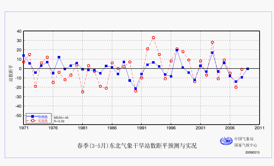 5 春季(3-5月)东北气象干旱站数距平预测与实况 东北 站数 AAA 预测实况 2009
