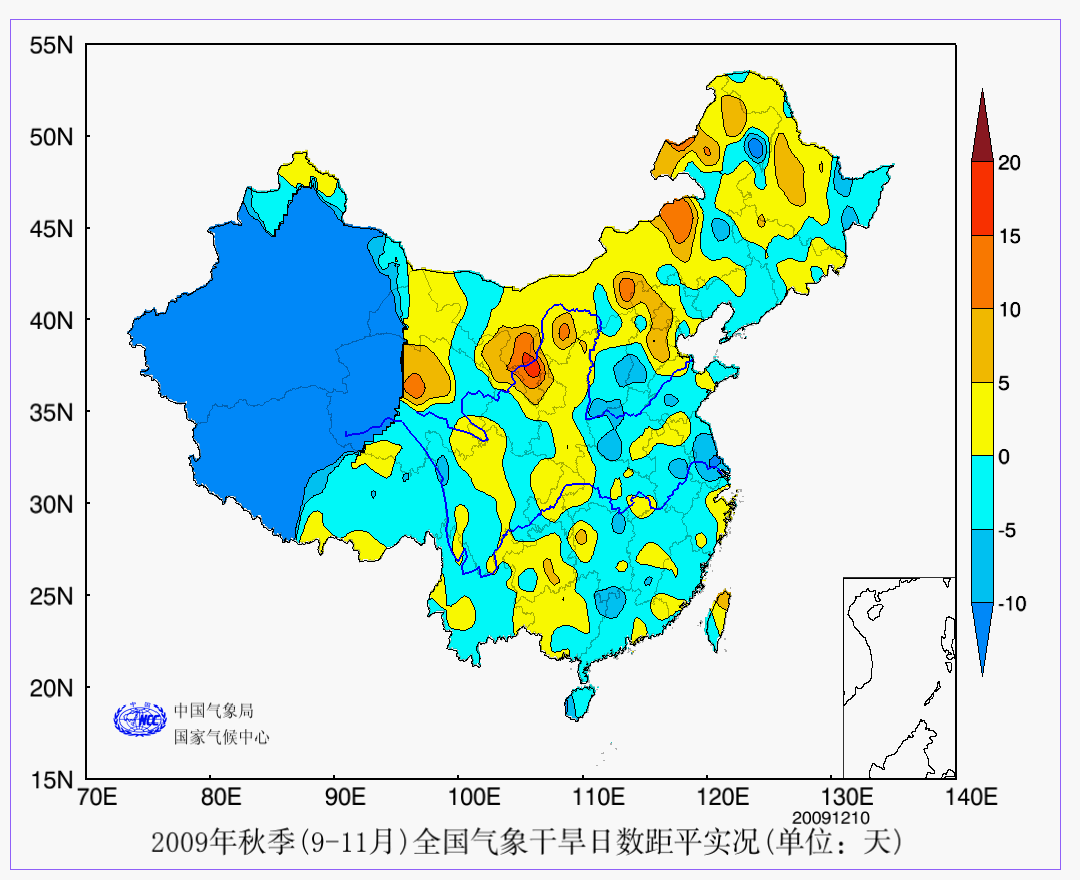 20 YEAR年秋季(9-11月)全国气象干旱日数距平实况 AAA 实况 2009