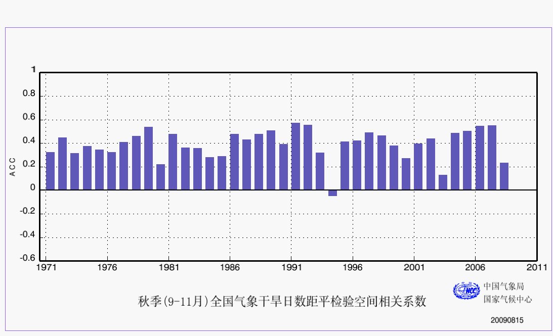 21 秋季(9-11月)全国气象干旱日数空间距平相关系数 ACC 逐年变化 2009 son_cn_nday_acc_2009ch_