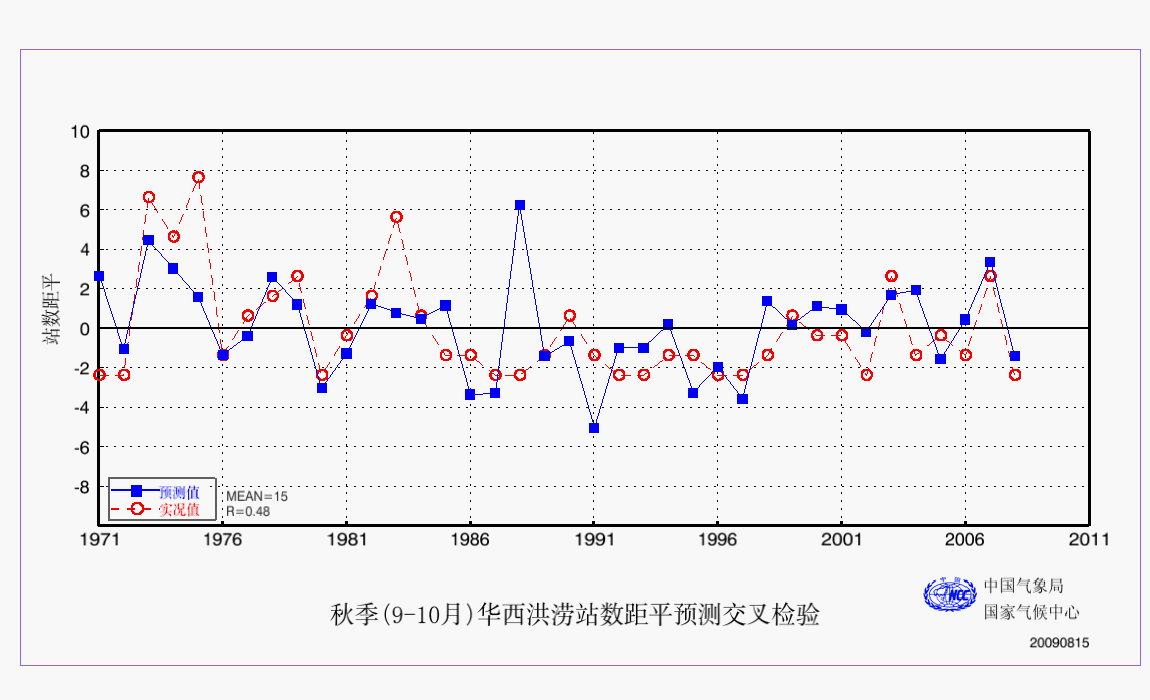 27 秋季(9-11月)华西洪涝站数距平预测检验 AAA 预测检验 2009