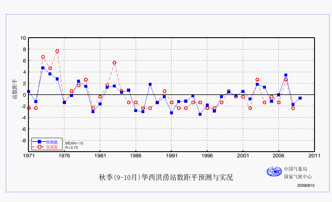 25 秋季(9-11月)华西洪涝站数距平预测与实况 华西 AAA 预测实况 2009