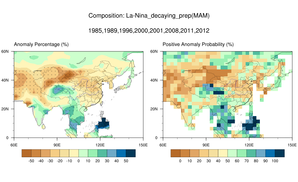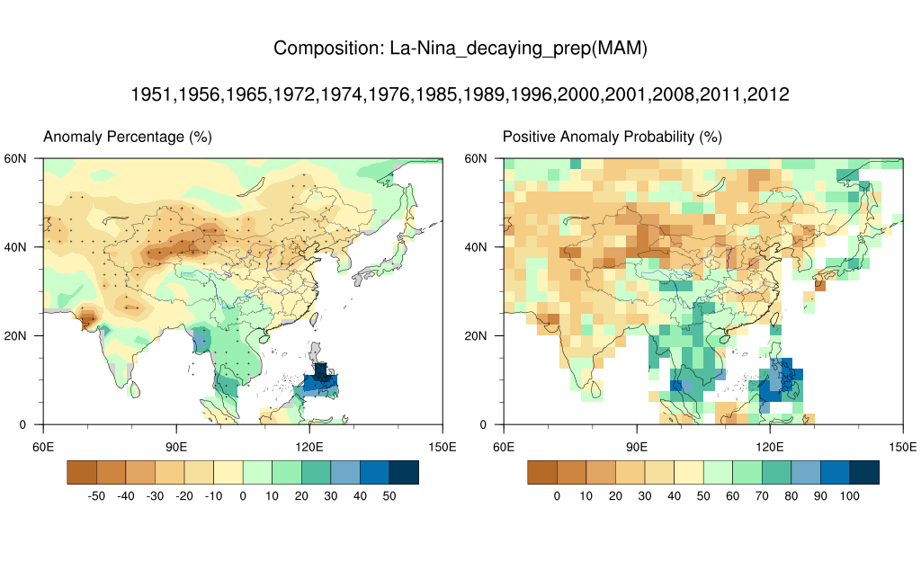 3) 合成分析中对El Nino/La Nina事件的选取标准参考“ENSO事件监测标准”。在合成分析图中,提供距平合成和正距平概率合成两种方式,图中黑色“+”标出的地区代表结果通过了显著性检验(显著性水平为0.05)。