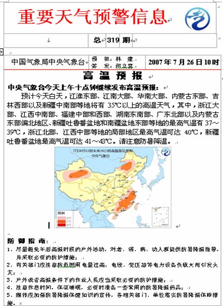 当高温范围和强度达到一定程度时,中央气象台及时发布预警,今年6月9日开始发布今年第1期《重要天气预警信息-高温预报》,并在《高温预报》中加入了高温区域图和防御指南,全年共计发布 80期《高温预报》。在今年7月21日至